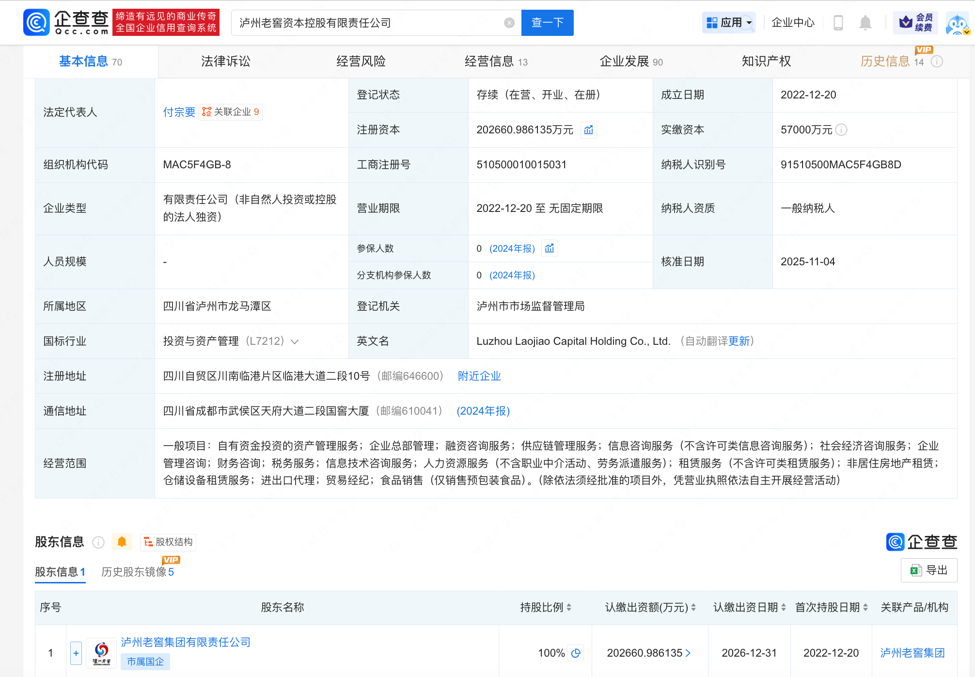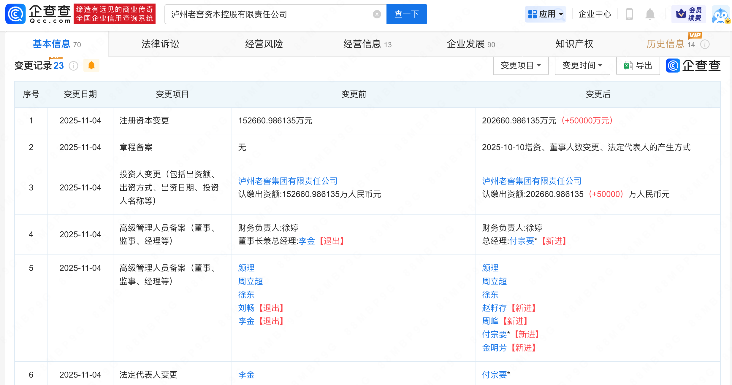近日,泸州老窖资本控股有限责任公司发生工商变更,注册资本由约15.3亿人民币增至约20.3亿人民币,增幅约33%,同时,法定代表人及多位主要人员发生变更。企查查信息显示,该公司成立于2022年12月策略盈,法定代表人为付宗要,由泸州老窖集团有限责任公司全资持股。