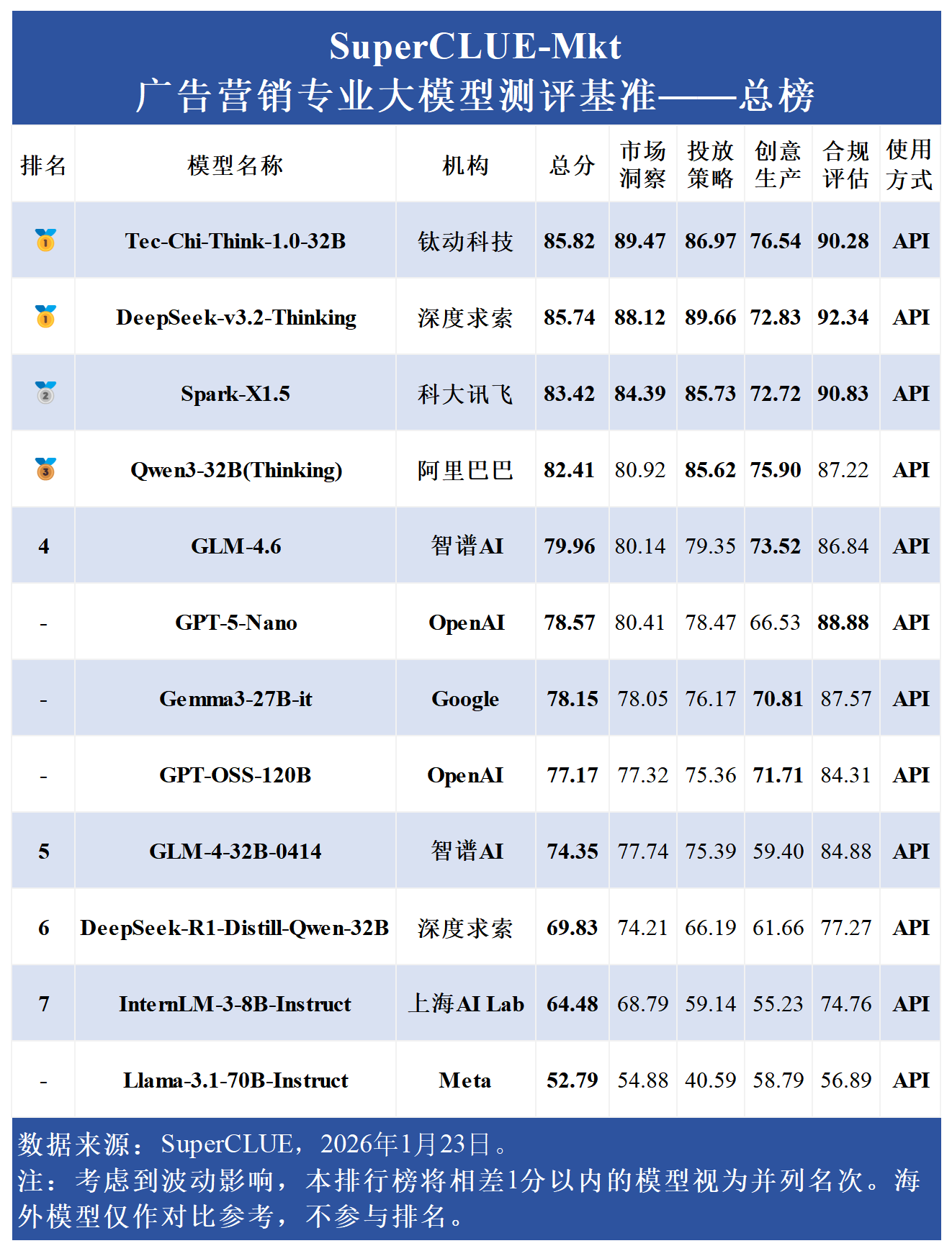 1月23日消息3G配资,专业中文大模型测评机构SuperCLUE近日发布《广告营销专业大模型测评基准榜单》,广州独角兽企业钛动科技自研的Tec-Chi-Think-1.0-32B(中文全称“钛极问答推理模型”)以总分85.82的成绩登顶。
